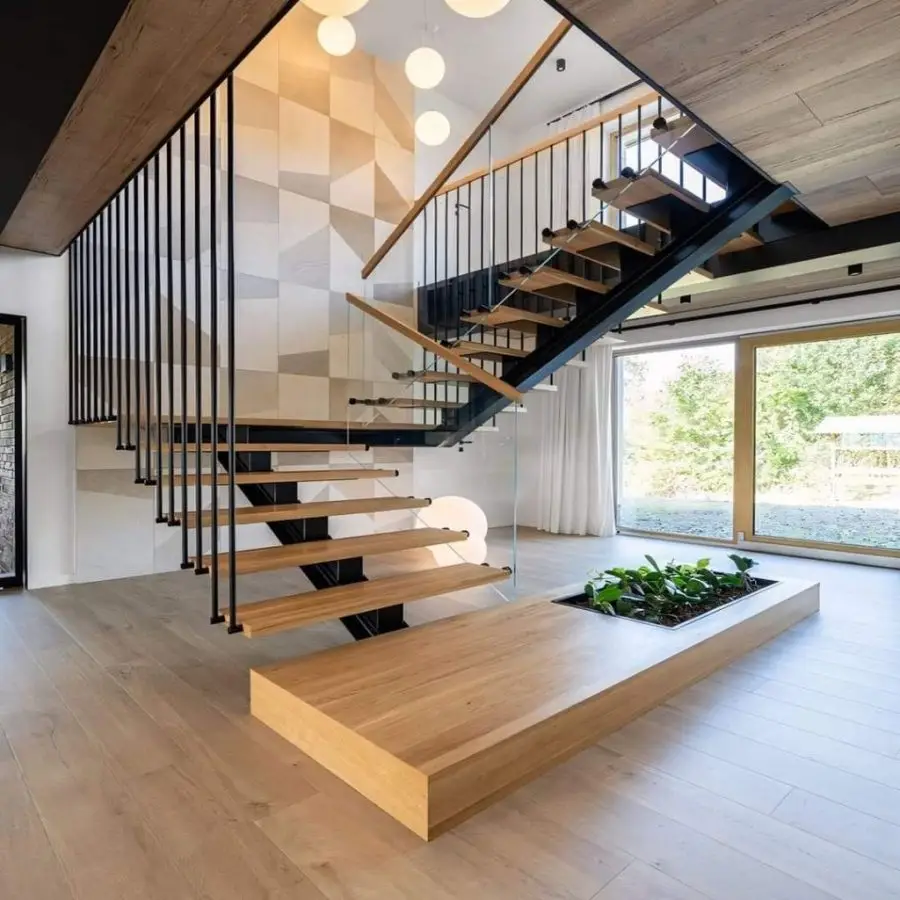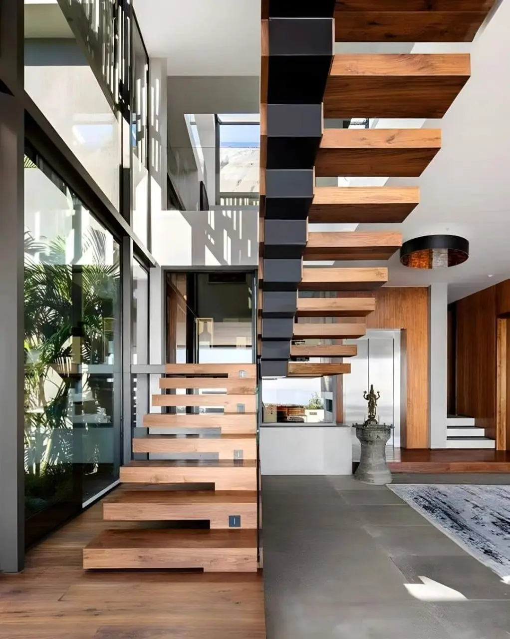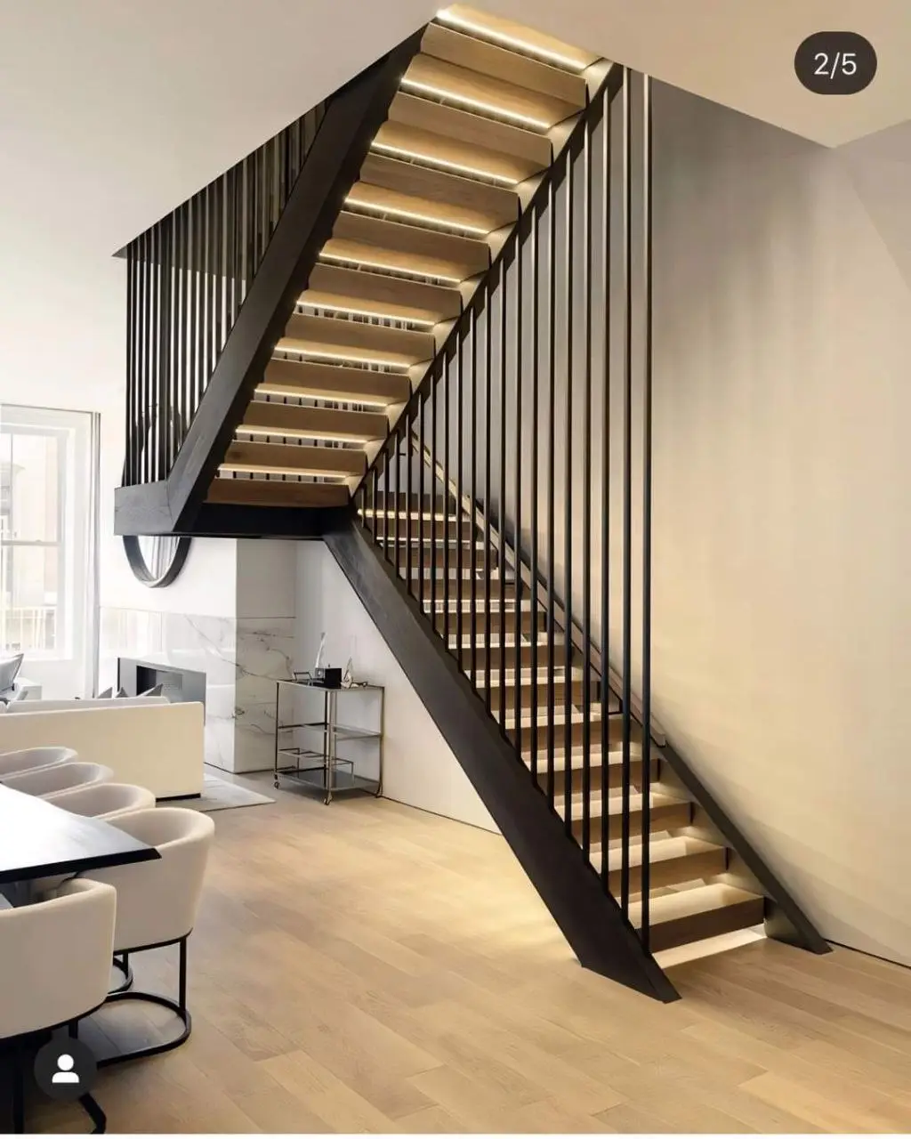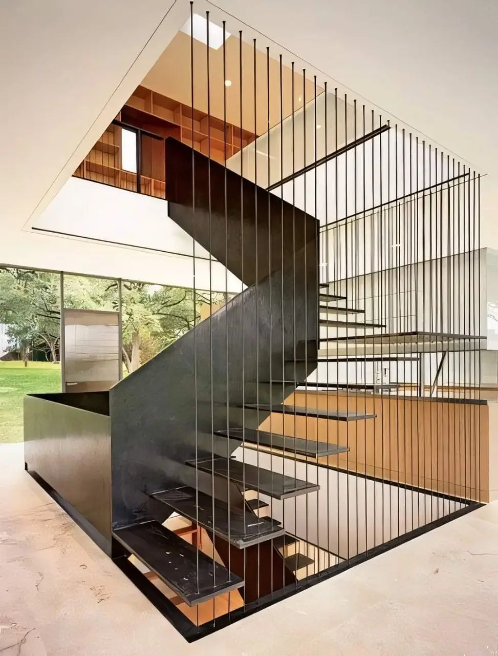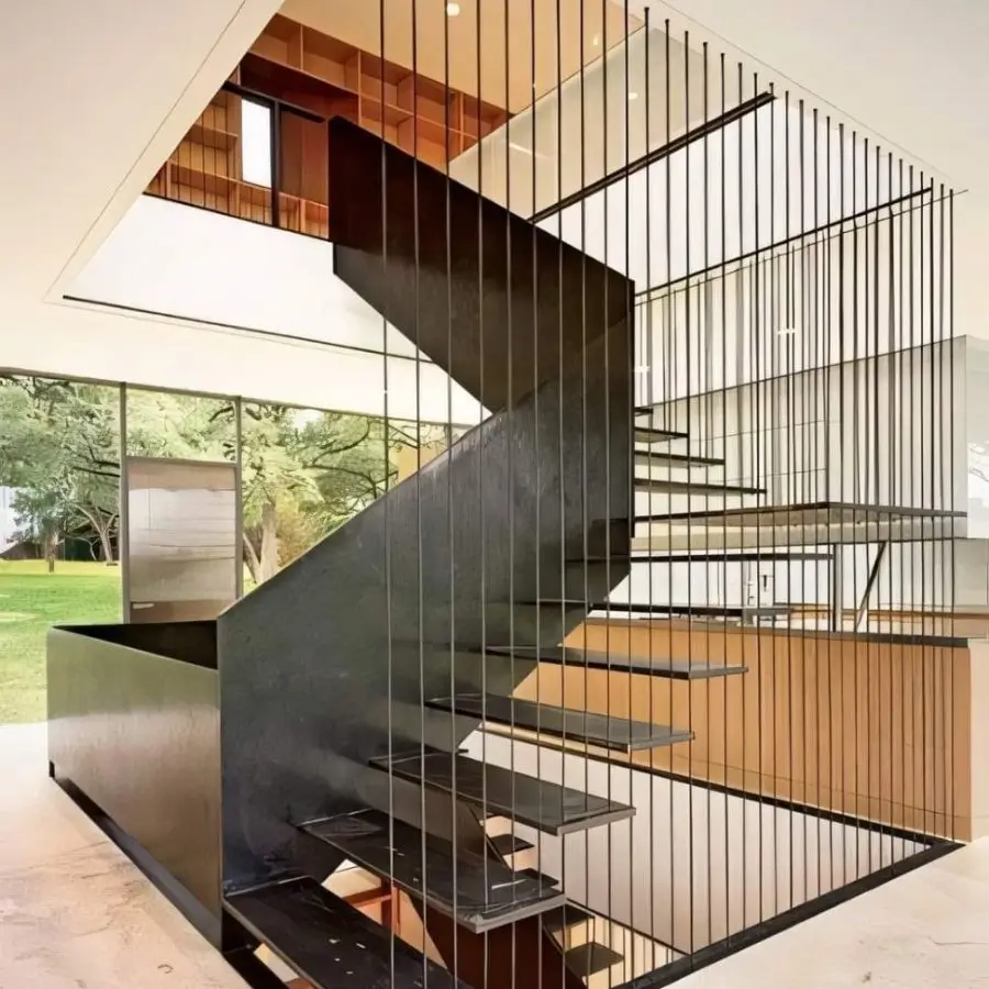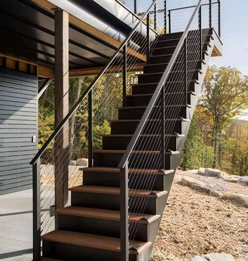 Indoor-outdoor modern staircases and house rails are essential elements of contemporary architecture and interior design, adding both functionality and aesthetic appeal to residential spaces. These features are designed to seamlessly blend indoor and outdoor areas, creating a harmonious transition between different living spaces.